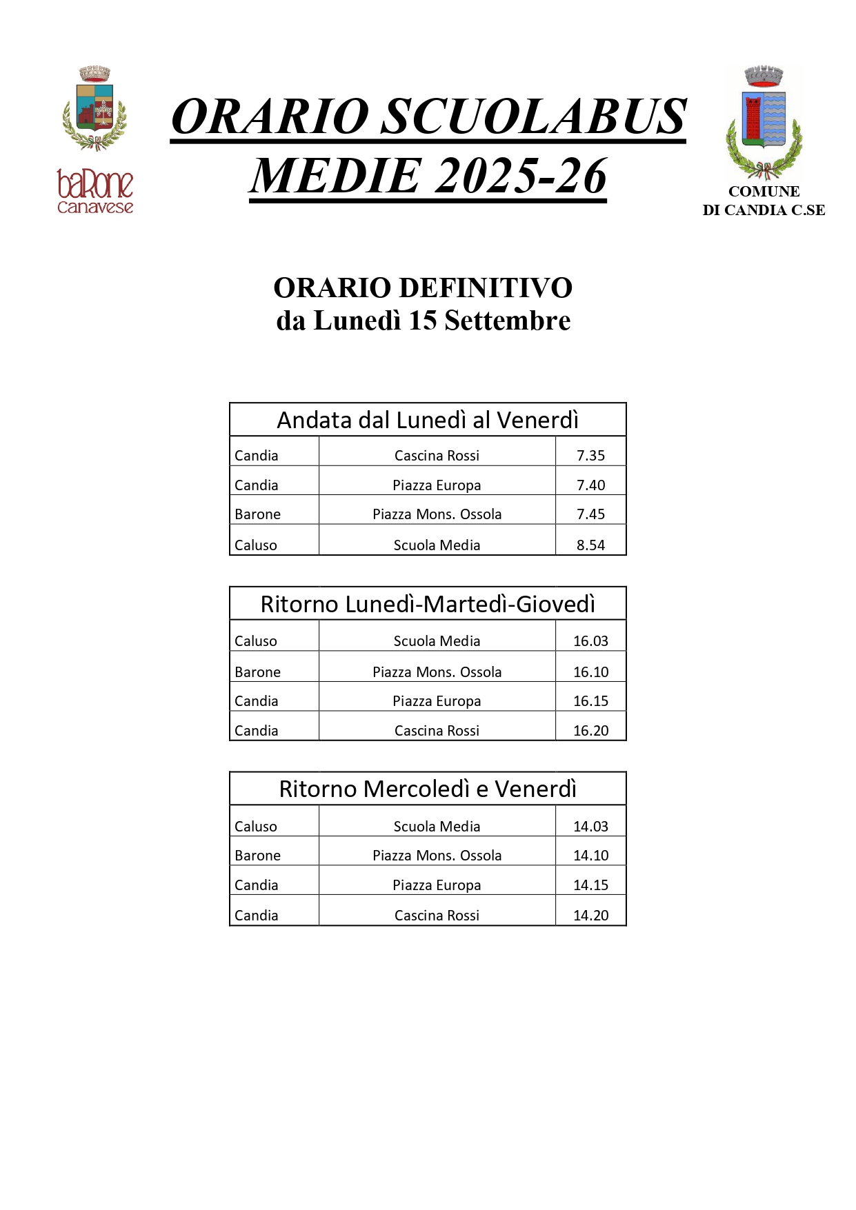 Descrizione Orario servizio scuolabus.Scuola PrimariaScuola Secondaria di Primo Grado Allegati Documenti Orario Scuola Primaria "DEFINITIVO" [.jpg 161,01 Kb - 04/09/2025 - 23/12/2025] Orario Scuola Secondaria di Primo Grado "DEFINITIVO" [.jpg 351,3 Kb - 04/09/2025] A cura di Servizi Amministrativi Ultimo aggiornamento pagina: 23/12/2025 08:09:25