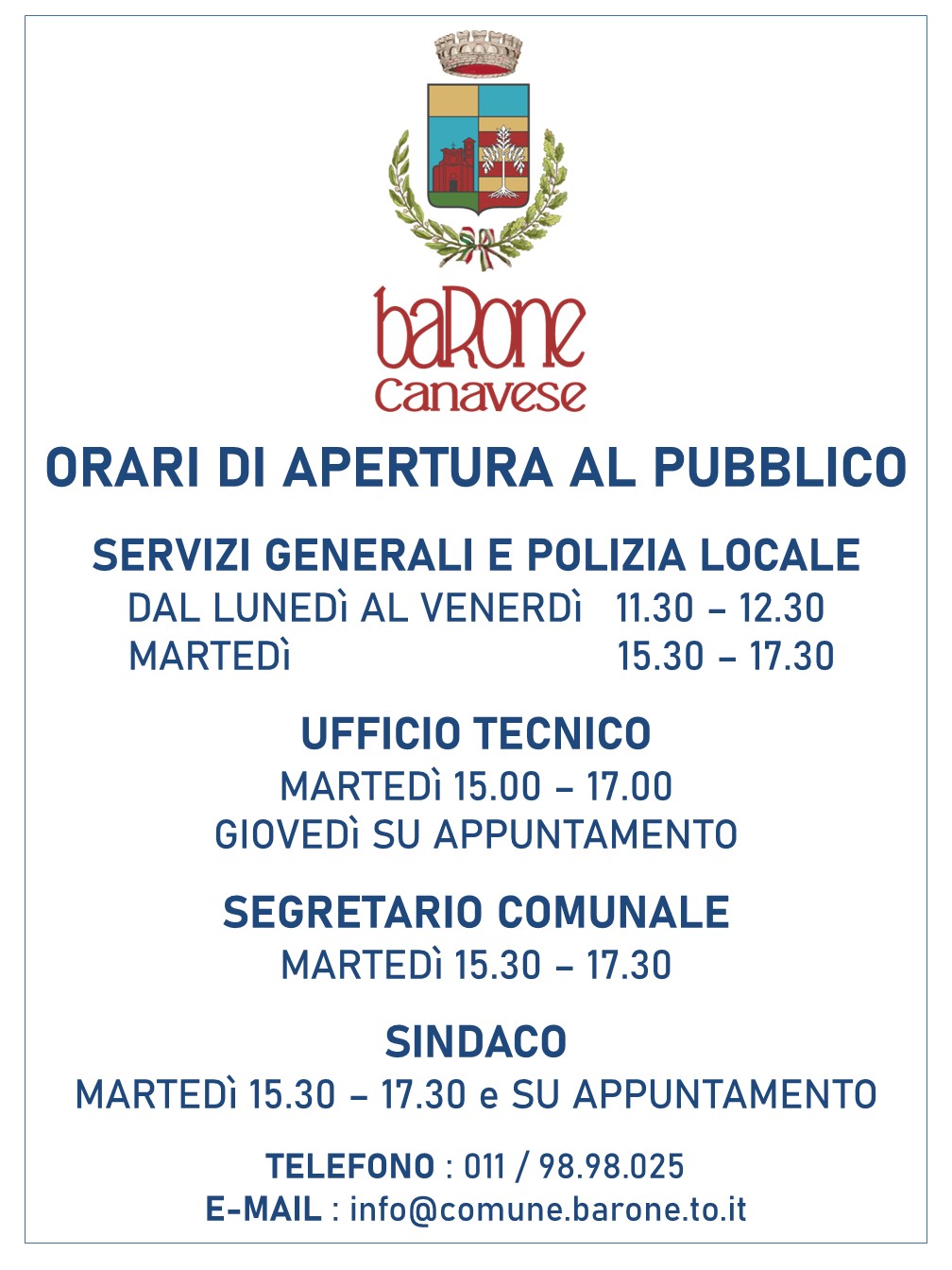 Descrizione Orari di apertura al Pubblico del Comune di Barone Canavese Allegati Documenti Orari di apertura al Pubblico Comune di Barone Canavese [.jpg 198,45 Kb - 09/03/2026] A cura di Servizi Amministrativi Ultimo aggiornamento pagina: 09/03/2026 11:38:07