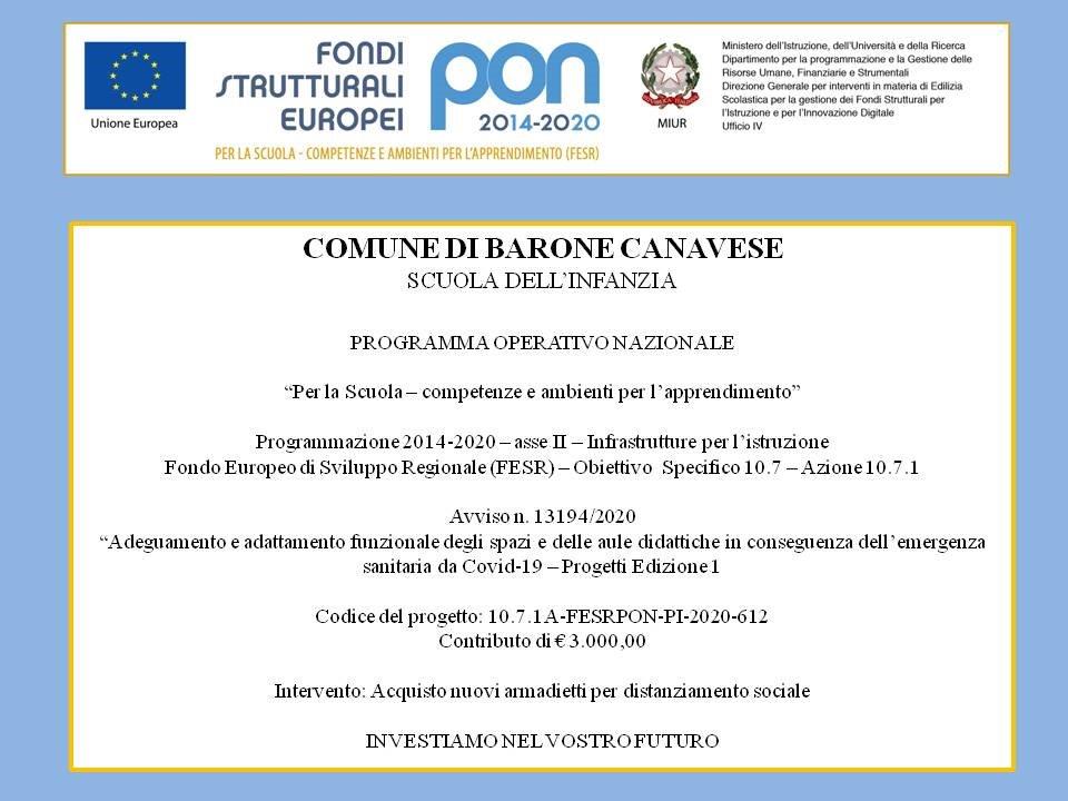 Il Comune di Barone Canavese è risultato beneficiario di un contributo di 3.000,00 euro per la realizzazione di interventi di adeguamento e di adattamento funzionale degli spazi e delle aule didattiche in conseguenza dell’emergenza sanitaria da Covid-19, nell’ambito dei Fondi Strutturali Europei – Programma Operativo Nazionale “Per la scuola, competenze e ambienti per l’apprendimento – 2014-2020”.
